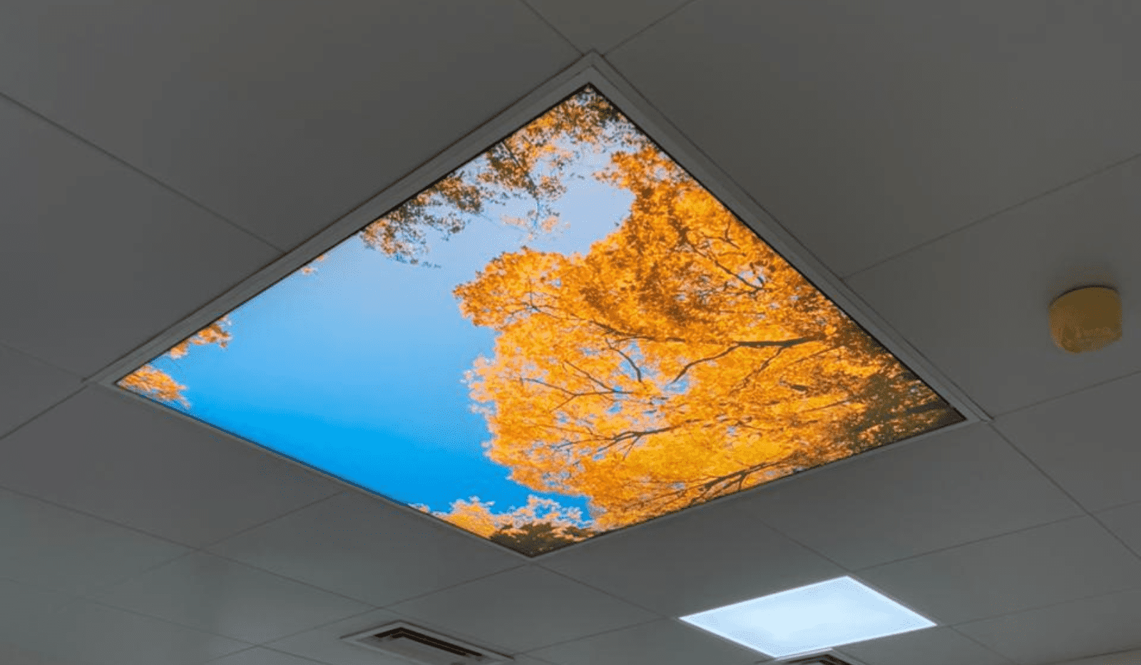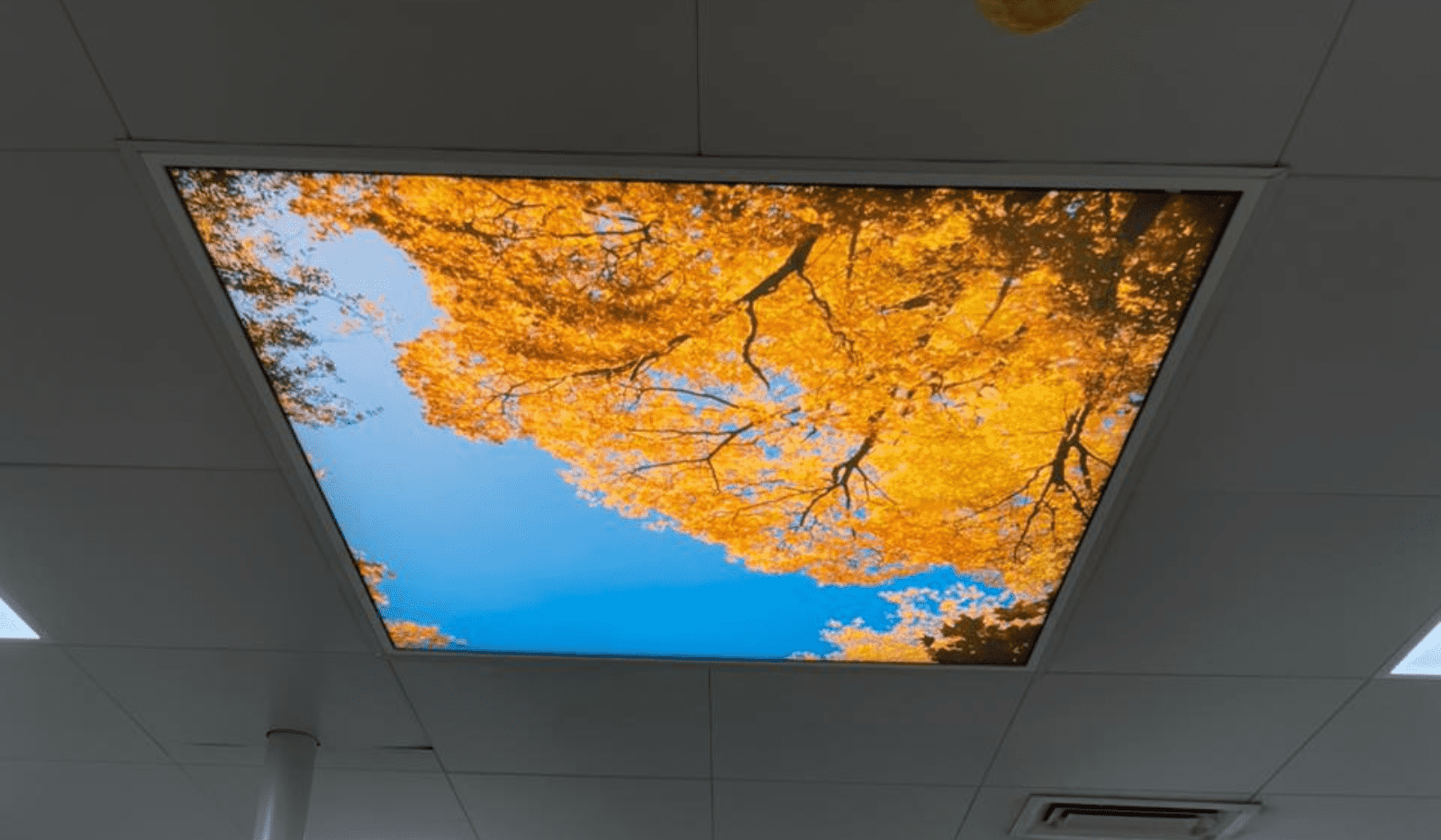 This single ceiling installation incorporates a custom-printed visual that brings a sense of calm and openness to the space, transforming the ceiling into a focal design element. The printed stretch ceiling not only elevates the aesthetic appeal but also supports functional lighting distribution, creating a clean, soothing, and modern atmosphere suitable for hospital interiors.