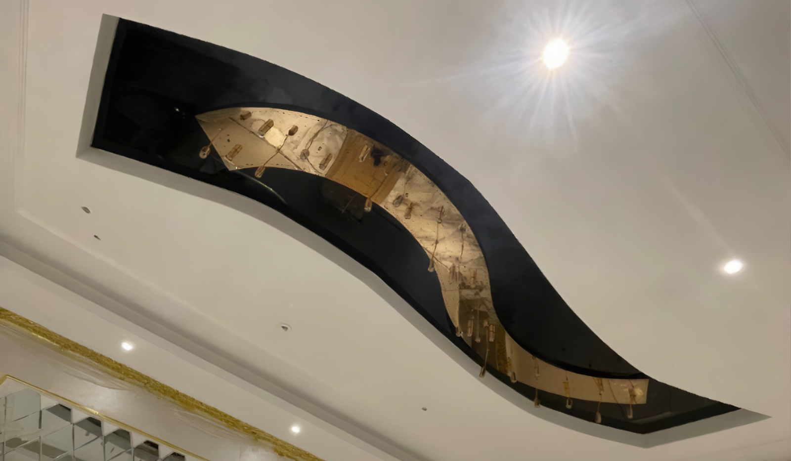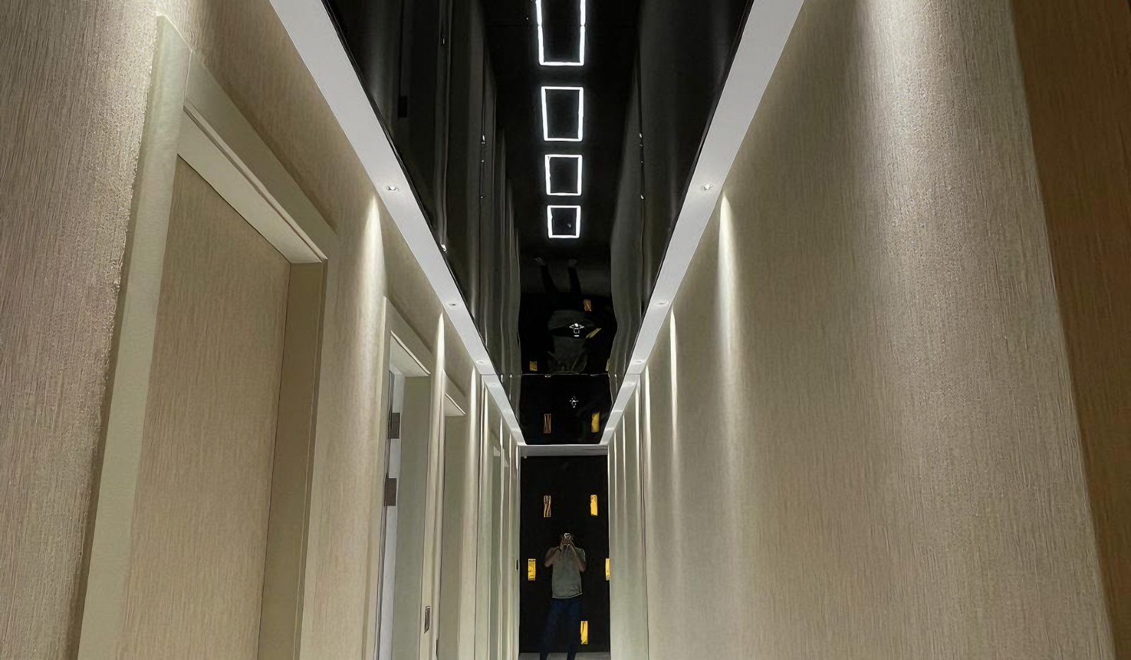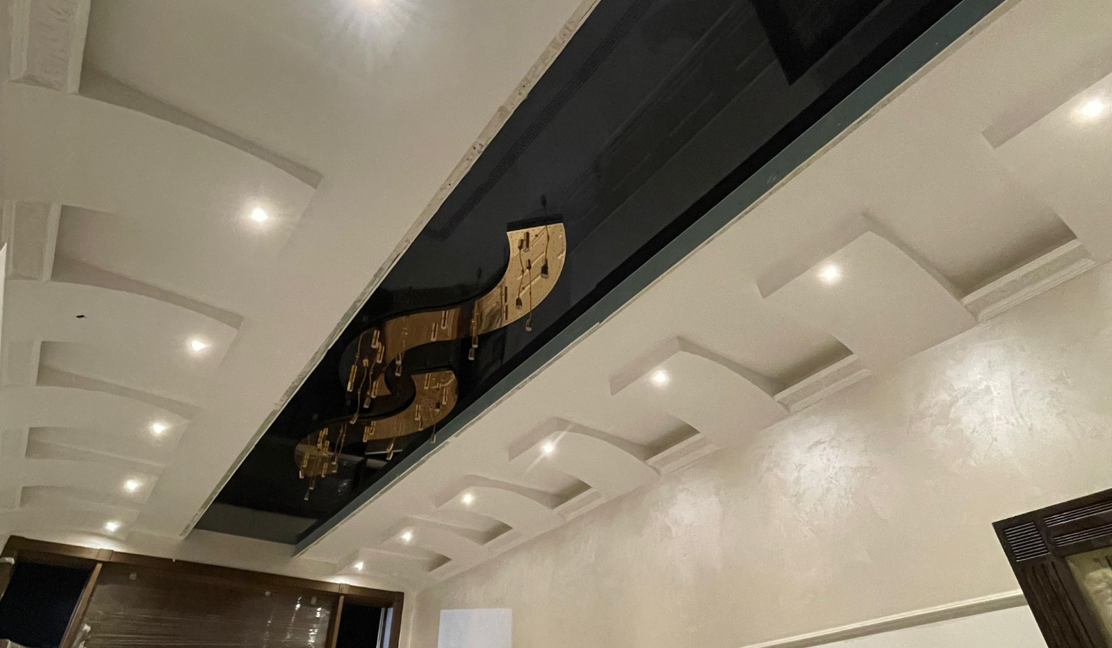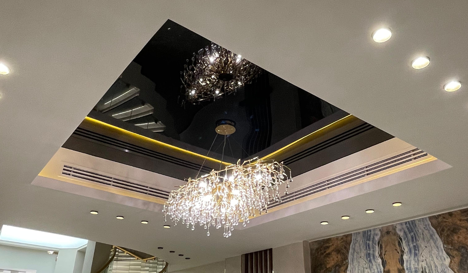 • Lacquered stretch ceilings can be made more interesting by using several levels, allowing you to play with light and flowers by equipping them with actual luminaires. Experienced designers can advise you on the most spectacular options based on individual preferences and room.